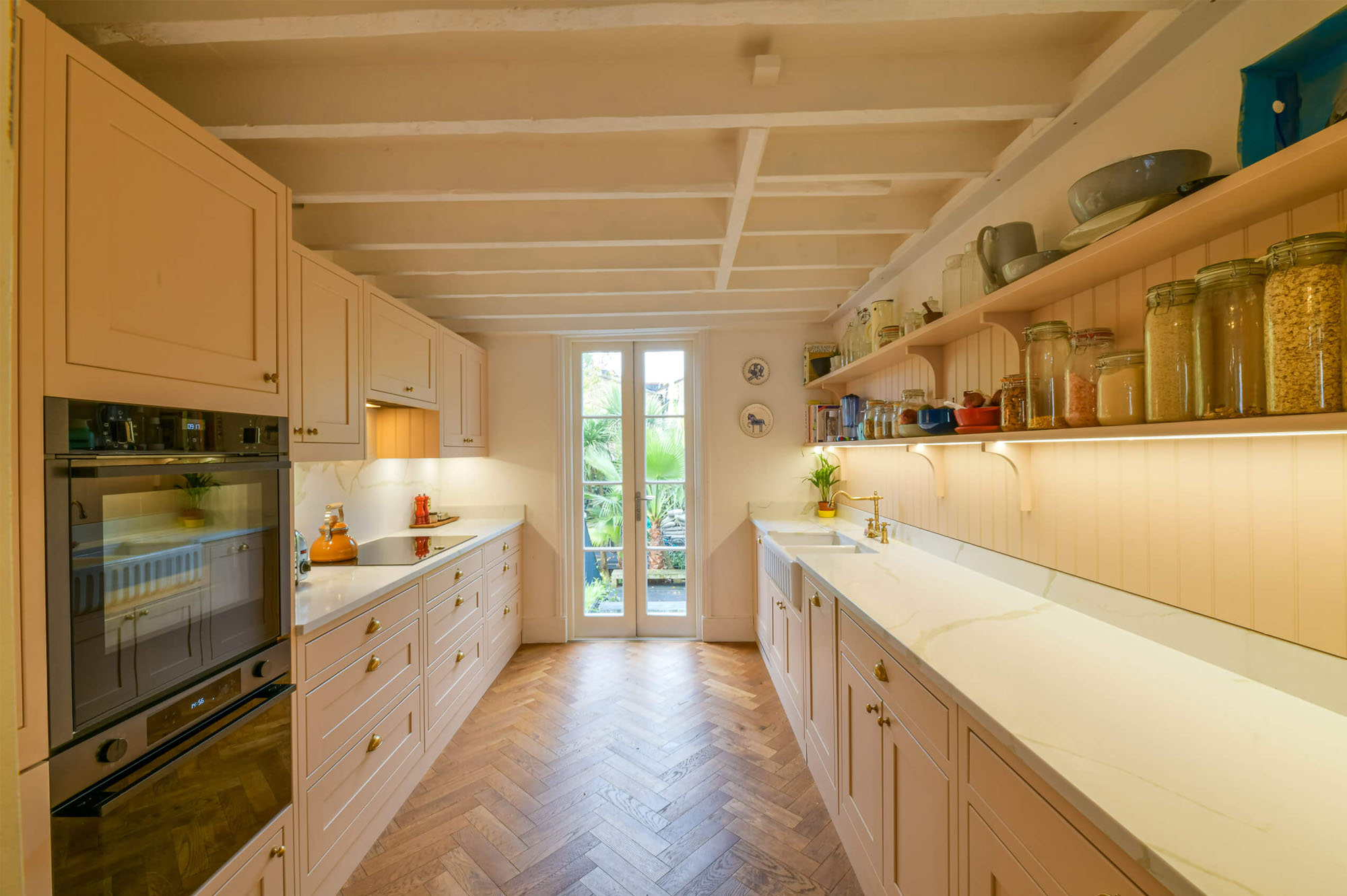 Open shelving showcases neatly arranged jars and décor, enhanced by warm under-shelf lighting that combines cosiness and functionality. The galley-style layout maximises space while maintaining a harmonious and timeless design.