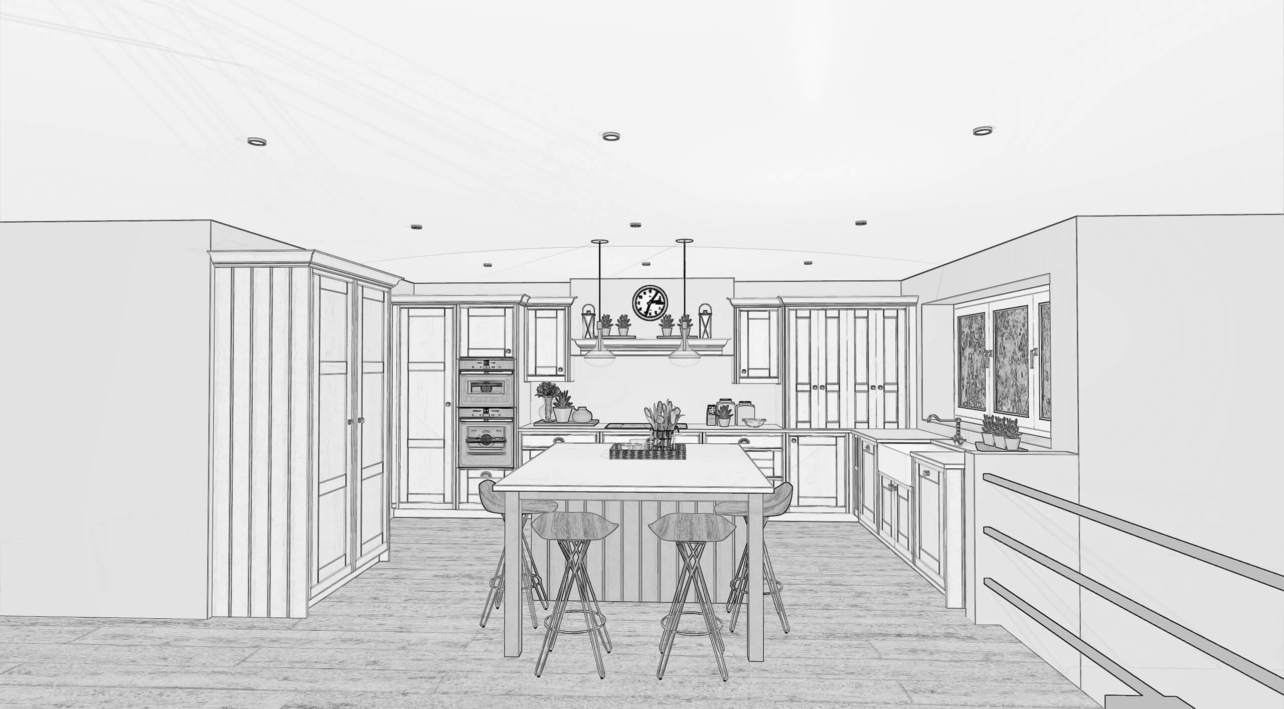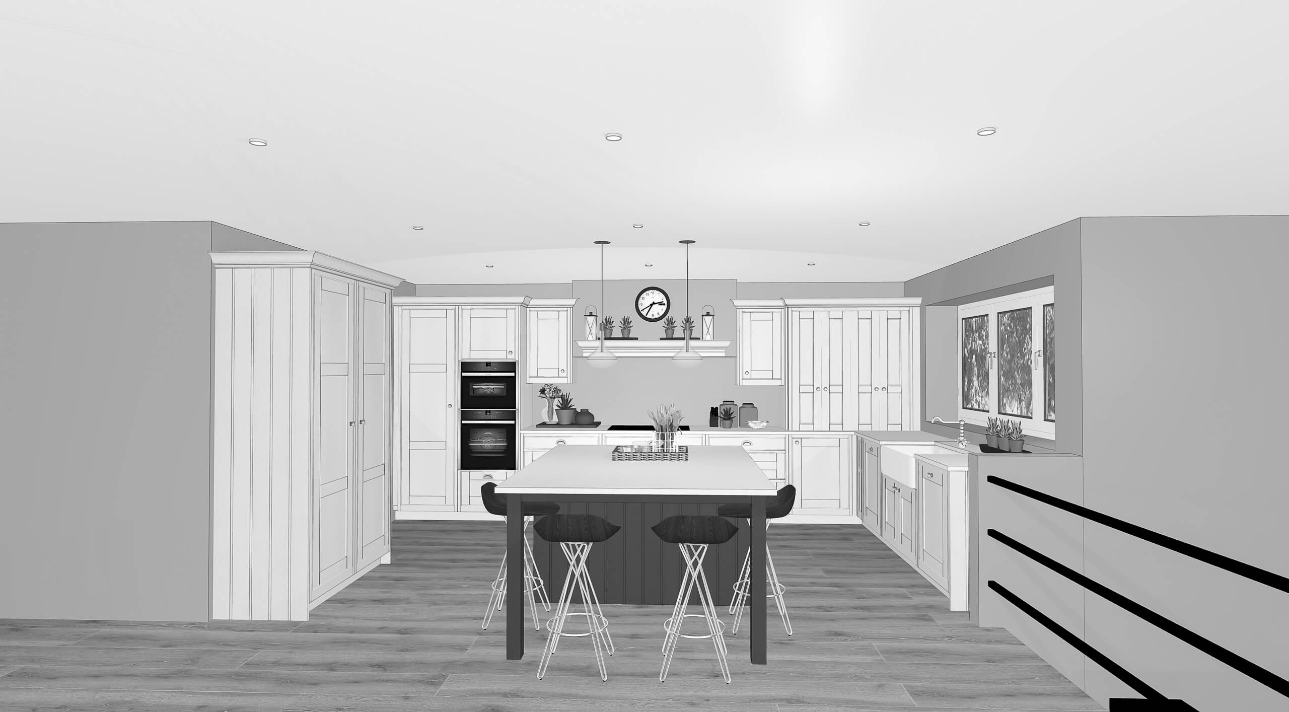 The client envisioned a kitchen that embraced the charm of a traditional farmhouse while offering modern practicality and style. They wanted intricate details like paneling, cornices, and trims to highlight the classic design, creating a space with character and authenticity. A central island with seating was a must for a functional and inviting gathering spot, while ample storage in larder units was key to maintaining organization. They sought materials that exuded elegance, such as subtly veined marble for the countertops, paired with warm brass hardware for a touch of vintage appeal. The inclusion of a farmhouse sink completed their vision of a cozy yet sophisticated kitchen.