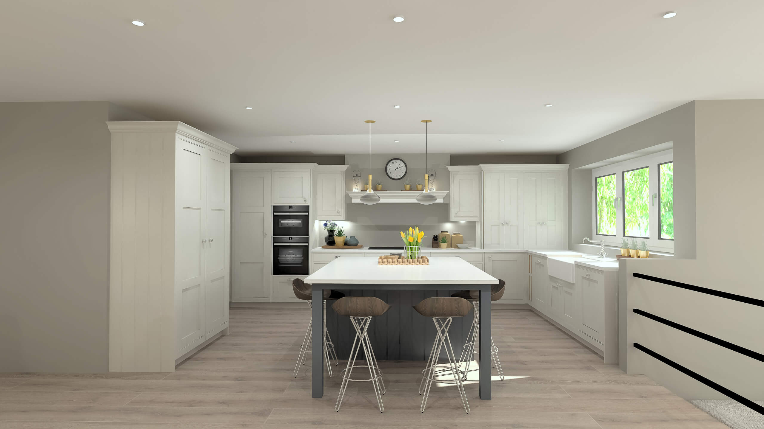 Larder units are a key feature in this design, offering generous storage space to keep the kitchen organised and clutter-free. These units are thoughtfully integrated into the cabinetry, preserving the farmhouse aesthetic while providing a practical solution for storing pantry items and kitchen essentials. The combination of form and function ensures the kitchen remains tidy and accessible.